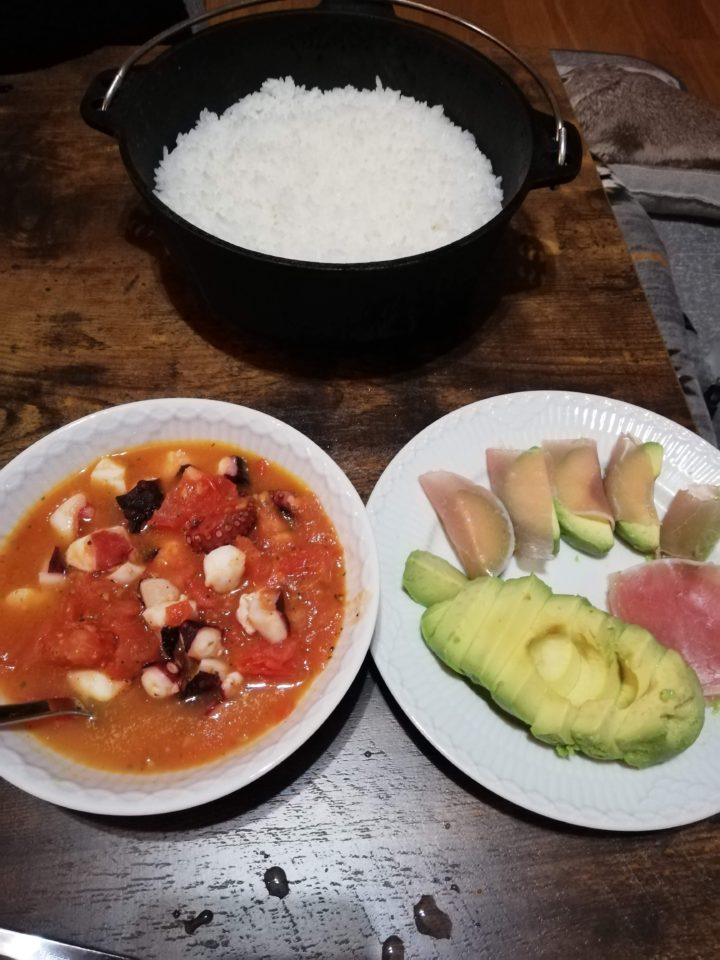 メインはタコのトマト煮込み。おつまみにアボガドにハムを添えて。