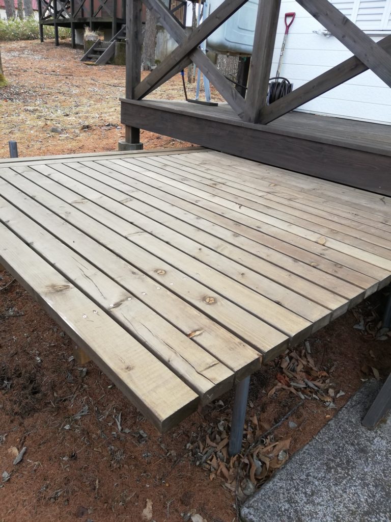 昨年作ったウッドデッキもこのありさま。しょうがないので気を取り直してチェアを投入。なんか家の前で夫婦で椅子に座っているさまはよく考えるとちょっと滑稽ですが、まあ、周りに人はほとんどいませんから気にしません。