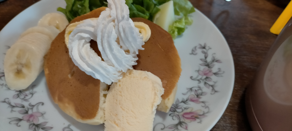 お昼はホットケーキにアイスとバナナと王道の生クリーム!