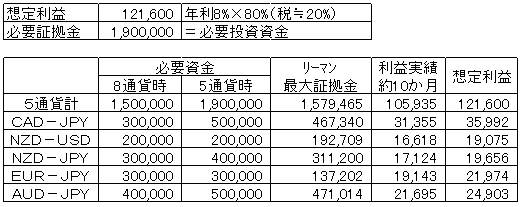 今回は年間運用利率8%、税金の支払いを≒20%と想定しました。期間中にある大きな相場変動を入れれば10%程度になりますがそこは想定に入れてません。各通貨の想定利益は私の10か月の資産運用実績の比率で5通貨想定利益121,600を分配した金額です。
