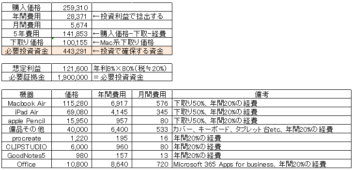 購入資金を5年間で単純に割るのではなく、Macハードの下取り費用や投資運用時の必要経費を確定申告で計上する(Fxなのでざっくり経費計上で経費の20%税金が返ってくるとして計算)ことを想定して実際にかかる費用を計算します。アップルのハードは再販性が高いので50%で売れると想定しました。メルカリなどで売却することを想定しています。