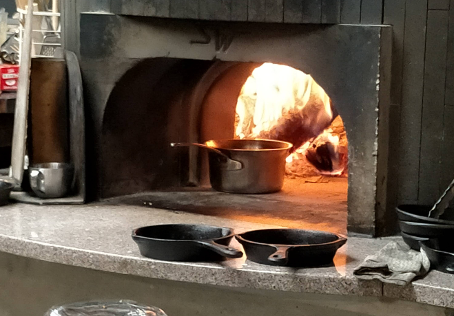 カウンターキッチンからのぞける場所に大きな石窯があり、こちらで様々な料理を調理します。火力がすごいからピザがあっという間に焼けてきます。