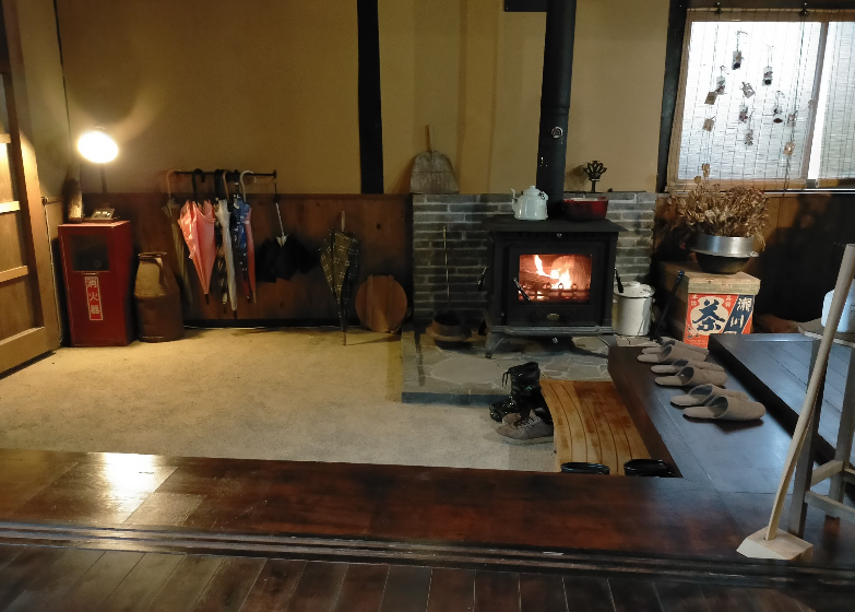 小さな扉を通るとてても大きな土間と風格のある薪ストーブがお出迎えしてくれます。この写真通りのアットホームな店員さんがお迎えしてくれます。