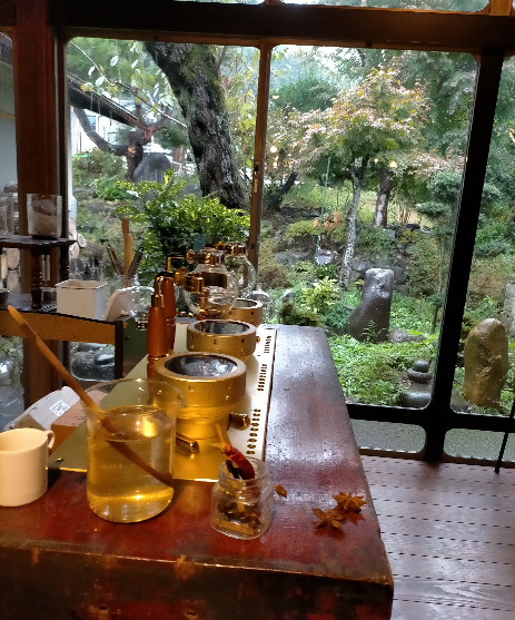 窓から見える中庭です。手前はコーヒーを入れる器具ですが、よくわかりません(笑)。コーヒーも美味しかったですよ。