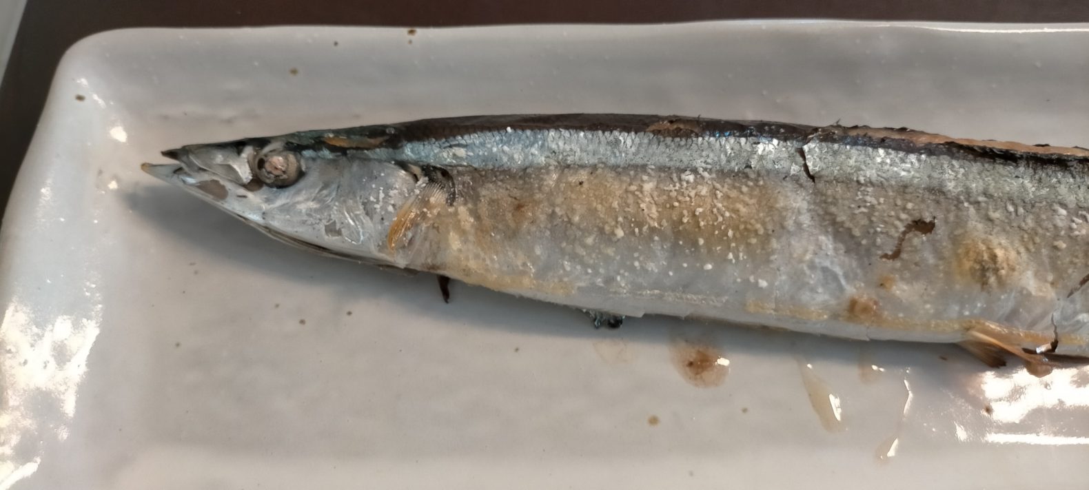 片栗粉と塩を入れた水でぬめりをとり(ほとんどないですけど)、天然塩を振ってグリルで両面10分。あっという間に油滴るサンマの塩焼きの完成です。