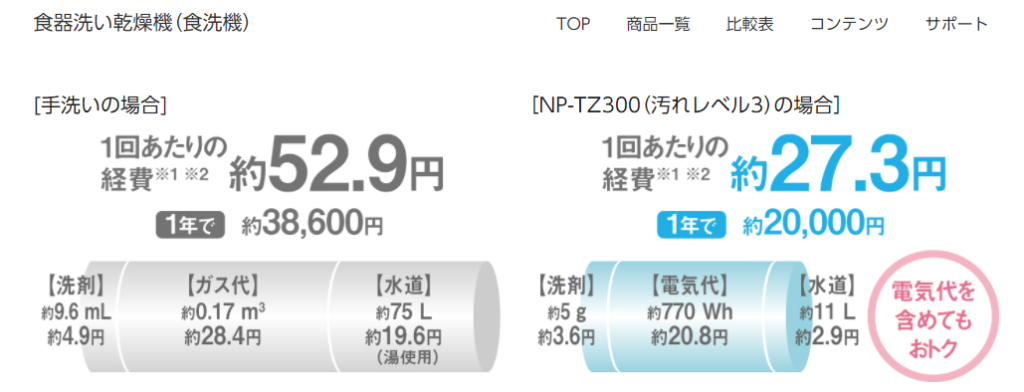 食洗器は手洗いの約半額です。乾燥込みの値段なので、乾燥機を使わなければもっと安くなります。