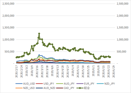 続いて高値ー安値の値動きです。高値は徐々に下がっていきますが、変動率が高い時は安値が下に大きく落ち込んでいるような傾向にあります。下落の圧力に日々耐えながら翌日反発を繰り返し、徐々に下がっていくという傾向です。CAD-JPYでは75円付近を底値で踏ん張っている様子がわかります。最大で約5円の変動があるので0.8円刻みであれば1日6回程度の決済、トータル2000万円設定である0.1円刻みであれば1日48回。まさに決済通知が鳴りやまない状態が続くということです。
