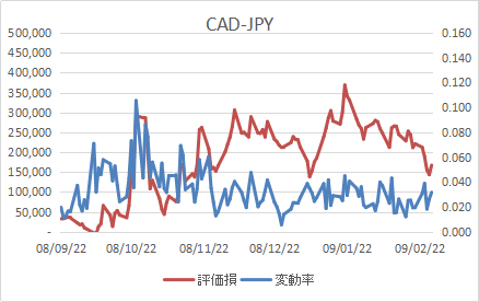 下記はコロナショック時のCAD-JPYの評価損(赤色)と変動率(青色)の動きです。変動率はその時の通貨価格に対する高値ー安値幅の率を示したものです。変動率0.1だと通貨価格の10%の値動きがあったという意味です。最近の平時の変動率は0.02以下です。