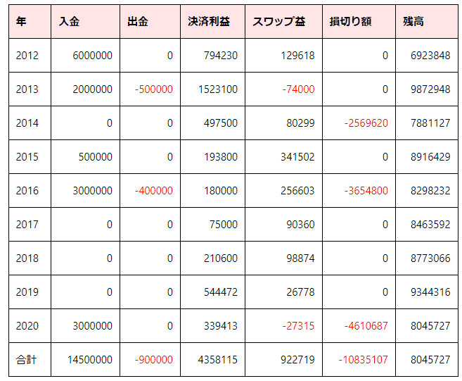 2012年から2020年までの8年間の間にトータル520万もの利益をあげながら1000万円の損切を行い失敗したとおっしゃられています。